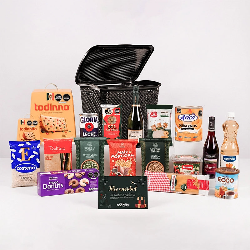 No escatimamos en detalles: desde los clásicos Duraznos Arica y la Cebada Ecco para el desayuno, hasta arroz y aceite de la marca Costeño. Todo presentado majestuosamente en un Cesto de estructura tipo Ratán (Polinplast), un contenedor elegante y duradero que elevará la decoración de cualquier hogar.