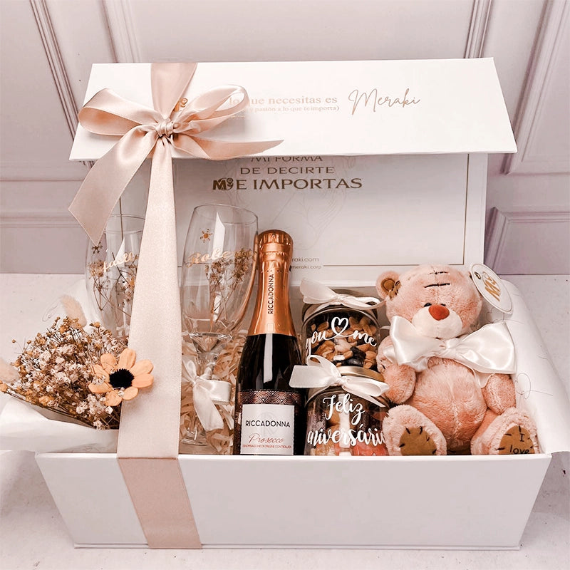 Regala un momento íntimo lleno de significado; copas grabadas, espumante y un detalle adorable. Una experiencia lista para celebrar el amor.