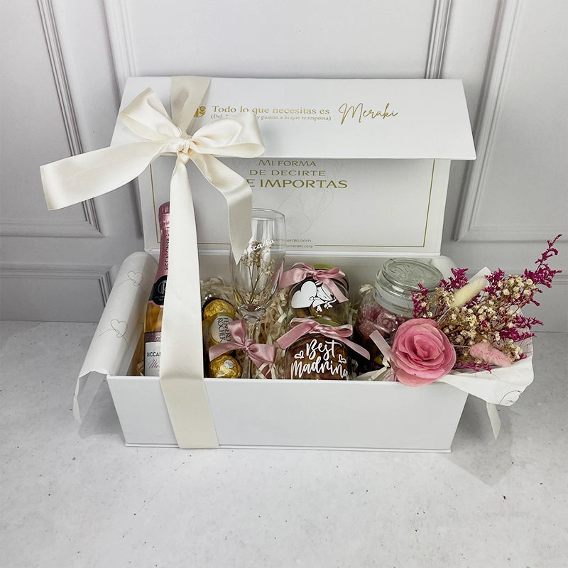 Un detalle pensado para celebrar a esa madrina tan especial, con un toque de elegancia y dulzura. Madrina Deluxe reúne delicados elementos que transmiten cariño, gratitud y un momento para disfrutar.