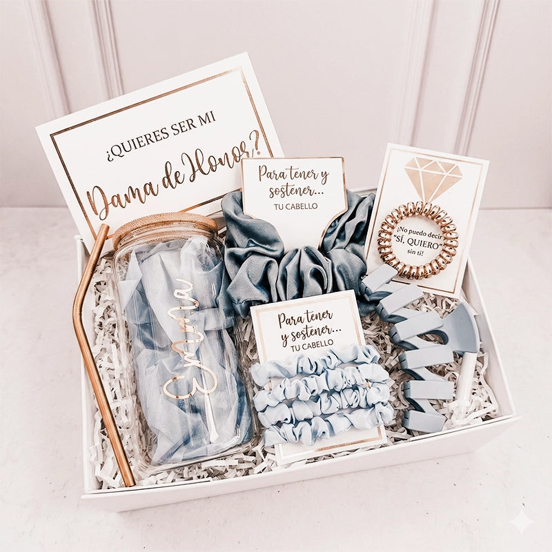 Un detalle moderno y delicado que combina tonos acero con un estilo femenino ideal para consentir a tus damas de honor. ¨Steel Glam¨ aporta brillo, cariño y elegancia creando un momento especial.
